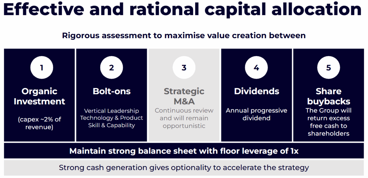 First, the Group is highly cash generative with 95%+ of adjusted free cash flow conversion to adjusted operating profit. Our approach is to focus on organic growth as a priority and then where appropriate to leverage our strong cash flows to create value through M&A. We believe that provided we can execute on strategic deals, M&A is a great long-term value creation opportunity for shareholders. This remains a core strategic lever for the group going forwards. However, in light of current market conditions, you can see that we have greyed out the strategic M&A box as acquisitions are not an immediate focus at this point in time but we are retaining some flexibility if market conditions were to change or if attractive opportunities arose.